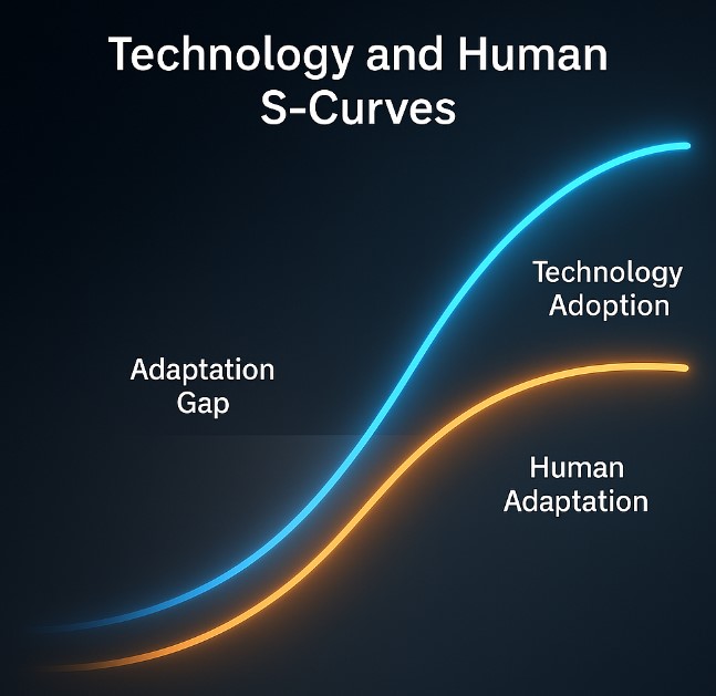 Consider again the two S-curves: one representing the rapid rise of technology, the other the slower but essential rise of human adaptation. The space between them, the adaptation gap, holds both anxiety and opportunity. The work of leadership is to close that gap through deliberate investment in competencies, learning systems, and culture. The faster the human curve rises, the greater the organization’s resilience and value.